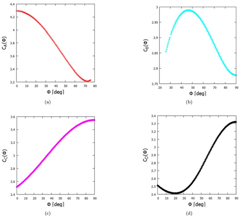 The values of the modified Jacobi constants at the contact points in each region in Figure 9 are shown in Figure 10. Figures 10(a) - (d) show how the values of the Jacobi constant at regions A, B, C, and D (CA , CB , CC , and CD , respectively) vary as a function of the azimuthal angle Φ. In Figure 10(a), we see that the values of the Jaccobi constant CA (Φ) decrease as the azimuthal angle Φ increases. For CB (Φ), one notes that initially the value of the Jacobi constant increases with increasing azimuthal angle, and then it decreases, as shown in Figure 10(b). This behavior causes a maximum value for CB (Φ), which happens at CB = 2.989303755, for Φ = 46.524234◦. On the other hand, the values of the function CC (Φ) increase as we increase Φ. Finally, for CD , as we increase Φ, initially the values of CD become smaller, reaching a minimum value of CD = 2.4120014 when the azimuthal angle is approximately Φ = 19.987◦, and then they increase.