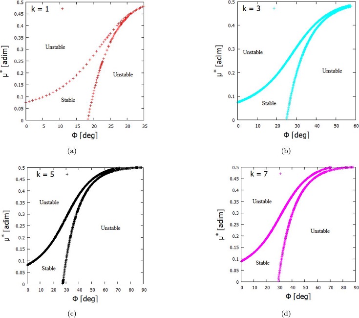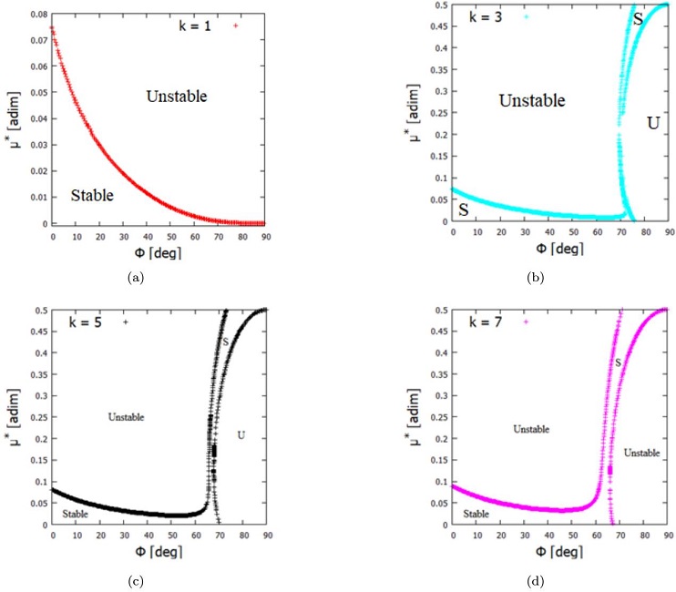 Figures 12(b) - (d) show Φ versus µ∗, which illustrates the stability regions, when k > 1. Figure 12(b) shows two stability transitions. Note that the first transition starts when Φ = 0◦ and µ∗ is approximately 0.074.