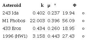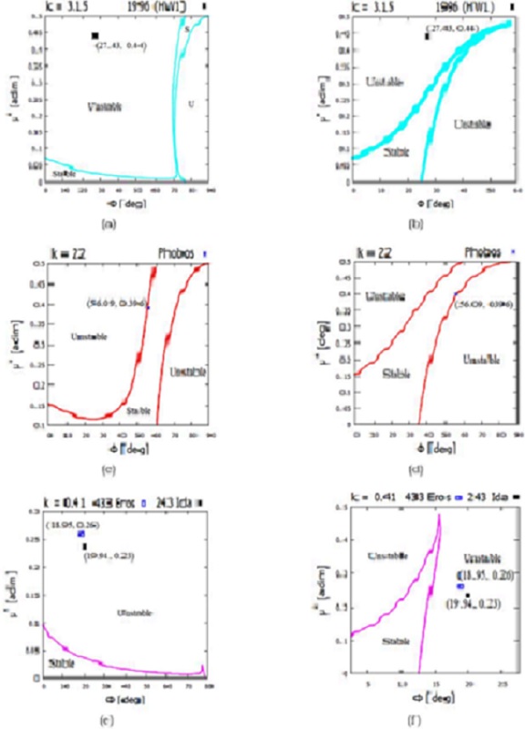 Finally, Figure 13(e) and (f) provide information regarding the stability condition for 243 Ida and 433 Eros asteroids. In Table 3 we see that k for asteroids 243 Ida and 433 Eros are very close. Because of this, we will show the results for these two asteroids on the same graph, in Figures 13(e) and (f). We plotted (φ,µ∗) = (18.95,0.26) and (φ,µ∗) = (19.94,0.23) for 433 Eros and 243 Ida asteroids, respectively.
