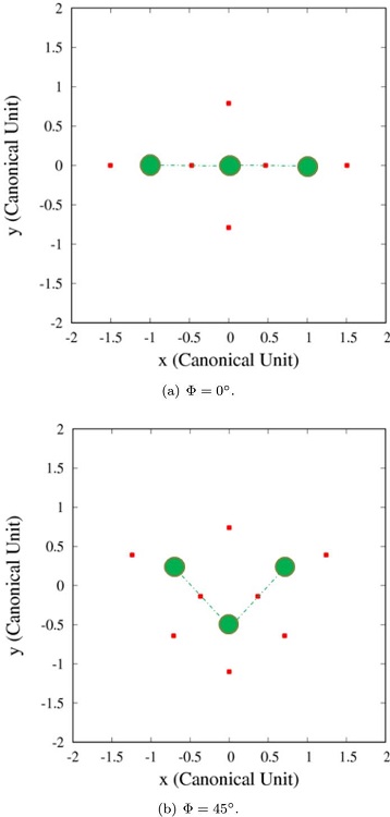 We start by computing the equilibrium points of the system. Figure 2(a) shows the points of mass M1 (green circle on the left side), M2 (green circle on the right side) and M3 (green middle circle), and six equilibrium points (red) for Φ = 0◦, µ∗ = 1/3 and k = 1. The equilibrium points between M1 and M3 and between M2 and M3 overlap with the rod that connects the spheres (see Figure 1). Therefore, we assume that these equilibrium points are inside the body of the asteroid.