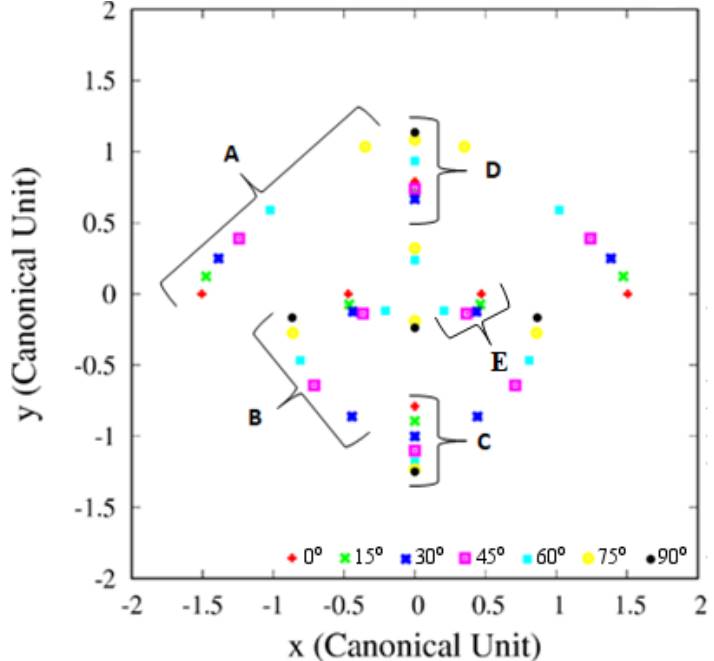 We performed numerical investigations to understand how the coordinates of the external equilibrium points change when µ∗, k and Φ are varied. To facilitate this analysis, we identified five regions, A, B, C, D, and E, as shown in Figure 3. We note that the regions are symmetric with respect to the y-axis. Observe that regions A, B and E are symmetric with respect to the y-axis, i.e., if the equilibrium point (in regions A, B or E) has coordinates (x, y), then there will be another equilibrium point in the coordinates (-x, y). Due to this symmetric property of the regions, we will only analyze the situations for which x is negative. Figure 3 displays the equilibrium points when µ∗ = 1/3, k = 1 and Φ is varying. It illustrates how the equilibrium points move as this parameter is varied. The corresponding azimuthal angles are given in the caption of the plot. One can note the “path” followed by the equilibrium points as Φ increases. For Φ = 90◦, the equilibrium points are equivalent to those of a dipole aligned at x = 0.