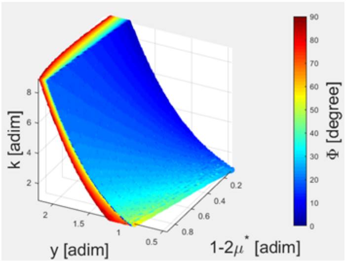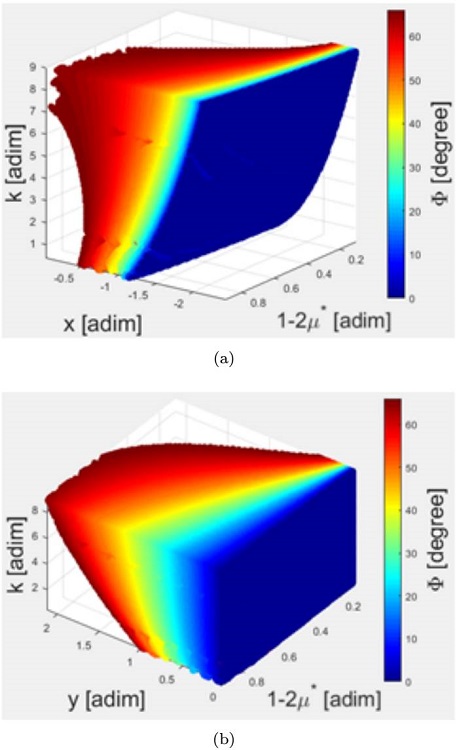 For region B, the variations of the x and y coordinates of the equilibrium points as a function of k, µ∗ and Φ are shown in Figures 5(a) and (b), respectively. For a better view of the path taken by the equilibrium points when we vary the parameters k, µ∗ and Φ , we insert a curve (black line) in the yellow region (Φ = 65◦).