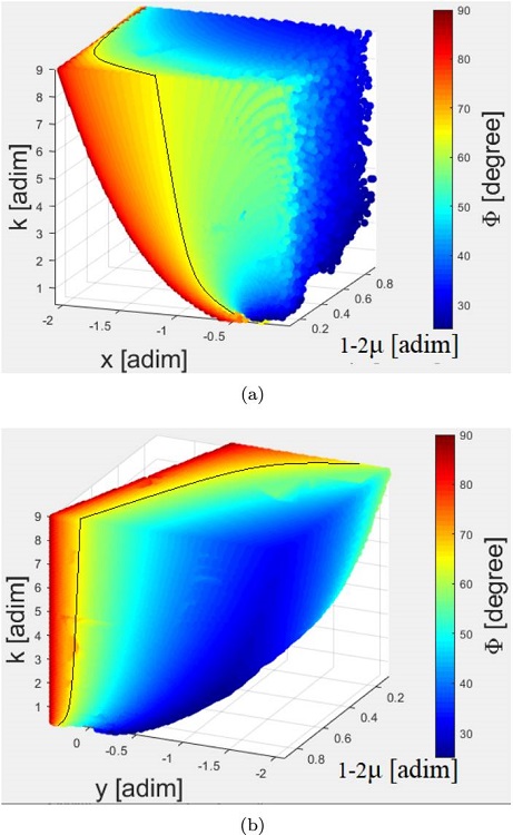 The second stability transition starts when Φ = 25◦, when the asteroid is 8◦ more arched than in the previous case, so the equilibrium point LC has a wider stable region compared to when k = 1. For Φ > 57.5◦, the equilibrium point LC is unstable for any mass ratio.