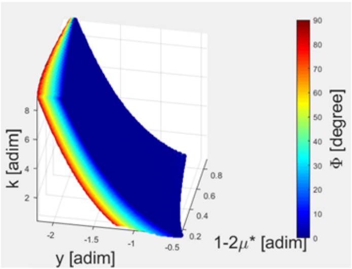 Figure 4 shows how the coordinates of the equilibrium points vary with k, µ∗ and Φ. Note that the graphs show the variation in the mass of the body M3, given by 1-2µ∗. That is, if the mass of M3 increases, consequently the mass of M1 (and M2), given by µ∗, decreases. The color bar represents the value of the azimuthal angle. First, we investigate the solutions when we vary k and keep µ∗ and Φ constant. Note from Figure 4 that as the rotation of the asteroid decreases, that is, as k becomes larger, the equilibrium points move away from the center of mass of the system. This is because increasing k implies decreasing the angular velocity of the asteroid around its own axis (see equation 9), thus making the value of the centrifugal force smaller. The condition of existence of an equilibrium point is that the resulting force at one point in space is zero, that is, the gravitational force and the centrifugal force must have the same value (in the module) but in opposite directions. So, to keep the centrifugal force at a value that counteracts the gravitational force, the distance from the center of mass to the position of the equilibrium points must increase. As k increases, the equilibrium points appear farther from the center of mass.
