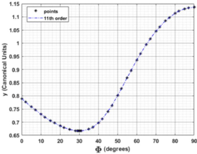 Then, as we increase the value of Φ, the equilibrium point values in region D decrease, approaching the center of mass of the system; they reach a minimum for ΦD = 30.32◦, and the y position of the D region that depends on Φ is y(Φ)D−min = 0.6664. Then they increase again, moving away from the center of mass of the system.