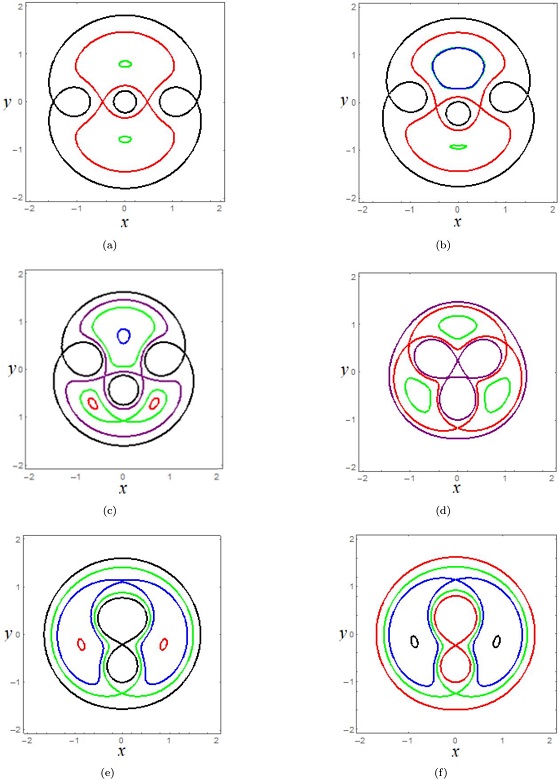 where r1, r2 and r3 are as shown in equations 6, 7 and 8. The zero velocity curves in the xy plane for six different values of Φ are shown in Figure 9. Each curve in frames (a) to (f) of Figure 9 corresponds to the value of the Jacobi constant for which the contacts between the ovals occur and the equilibrium points appear. The tripole is not illustrated in the figure.
