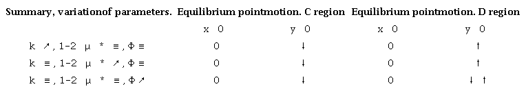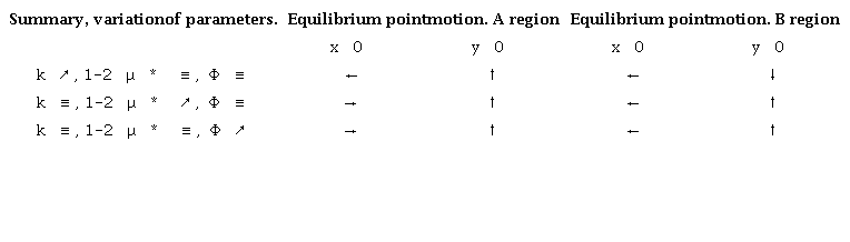 Analyzing the linearized equations, we observed that the condition of stability of the equilibrium points in regions C and D depends on k, µ∗ and Φ. For region C, we observed the appearance of bifurcations when k > 1. On the other hand, the equilibrium points in region D show two stability transition limits for any value of k. For both regions (C and D), it was observed that as we increased the value of k the region of stability became larger.