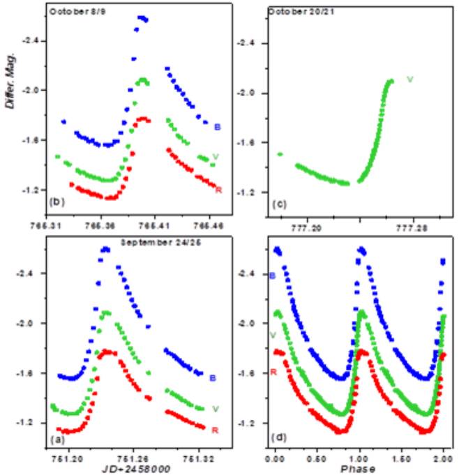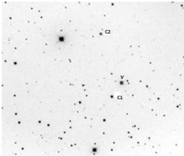 To investigate the variability of our target star (XX Cyg), photometric observations from the archives of the All-Sky Automated Survey for Supernovae (ASAS-SN), Wide Angle Search for Planets (SuperWASP), and American Association of Variable Star Observers (AAVSO) provided new maximum-light times for our target. The data, span a time interval of over 110 years, from the early twentieth century to the present, as shown in the references. We acquired four nights’ observations on September 24/25 and October 8/9, 9/10, and 20/21, 2019, as displayed in Figure 2. The observations were obtained through standard Johnson blue-visible-red (BV R) filters; and the exposure times ranged from 20 to 60 seconds, depending on the atmospheric conditions and background contribution. All observations from the Kottamia Observatory (KAO) were made using a 2048x2048pixel EEV CCD 42-40 camera, cooled by liquid nitrogen and attached to the Newtonian focus of the 1.88-m Kottamia reflector telescope in Egypt. The Kottamia Observatory is located at a latitude of 29°56'02.43'' N, a longitude of 31°49'40.1'' E, and a height of 467 m. Figure 1 shows one of the V -band images of the variable XX Cyg, along with comparison and check stars. The comparison star has coordinates α2000 = 20h03m18s and δ2000 = +58°55.6'6.9''. All times were corrected to Heliocentric Julian Date (HJD). Standard data reduction processes (i.e., dark and bias removal, flatfield correction) and aperture photometry have been applied to the present observations, using the free data reduction software (MuniWin) from the website (http://c-munipack.sourceforge.net/). We obtained differential instrumental magnitudes for each filter and constructed the present light curves of the system XX Cyg.