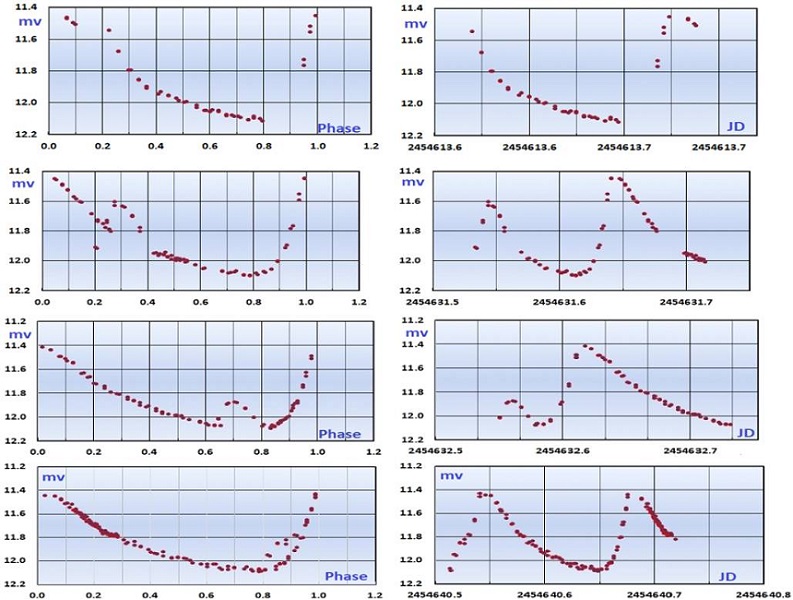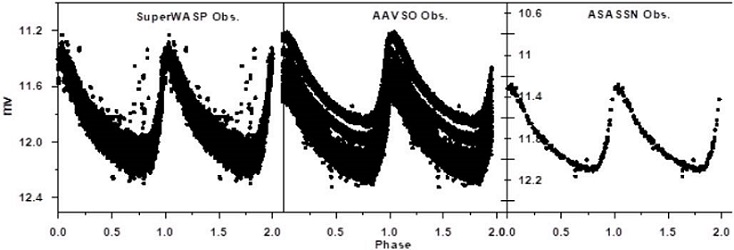 When we tried to test the amplitude stability of our system we noticed a damping in the light curves in some observations, as presented partially in Figure 6, from phase 0.1 to 0.8. These observations are from the SuperWASP Camera#145 on nights 2454613.59, 2454629.565, 2454631.54, 2454632.54, 2454659.46, and 2454660.46. These may be the same light curve bumps described by Blake et al. (2003) and Sadun and Ressler (1986). However, we did not detect the bump in our BVR observations. Also, we failed to observe similar bumps in the other automated surveys (Northern Sky Variability Survey (NSVS), Hipparcos Catalogue (HIP), Kamogata/Kiso/Kyoto Wide-field Survey (KWS), and ASAS SN). The SuperWASP bump detections are significant because the bump amplitudes are more than three times larger than the photometric errors of the dataset. Also, we noticed the positions and effects of the bumps changes with phases. i.e. a smaller bump with a dip of amplitude approximately 0.1 magnitude, which peaks at a phase of 0.15 and a larger bump occurring with ascending phases towards the brightness minimum (as seen at one phase in Figure 6). This damping in the light curve or bump in phase may be a result of magnetic activity or shock waves (Gillet, D. 1988, Balona et al. 2015).