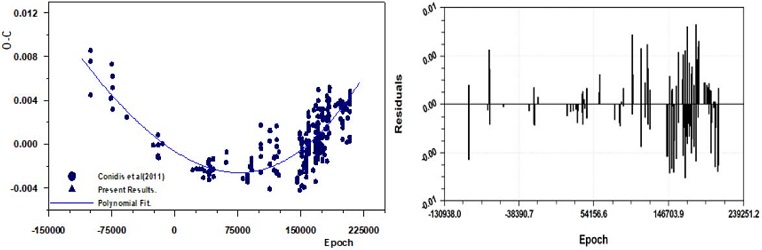 The parabolic trend in the O-C data reflects a regular period decrease or increase. From this analysis we find that the period is increasing at a rate of dP/dt = (15.50±1.10)×10−5 s/yr or ([1/P]dP/dt = 1.33 × 10−8yr−1). Our rate of period change agrees with an earlier estimate by Conidis et al. (2011) (1.337 × 10−8yr−1.) but differs slightly from Blake, et al. (2003) (1.13×10−8yr−1) because we used extra data at recent epochs, including our KAO observations.