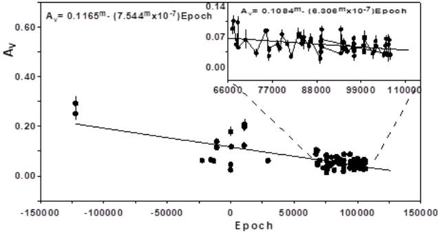 Variations in the amplitude, period, and shape of the light curves are known as the Blazhko Effect. This phenomenon can be seen easily in RR Lyrae variables. A frequency analysis of XX Cyg was performed with a package of computer programs, employing single-frequency (Fourier) and multiple-frequency least-squares techniques (PERIOD04, Breger 1990). The technique fits a number of simultaneous sinusoidal variations in the magnitude domain and does not rely on prewhitening. We analyzed the stellar light curves using the PERIOD04 program and FORTRAN programs to evaluate the Fourier parameters for all available observations. The amplitude behavior in the visible band is presented in Figure 5. Linearly fitting the variations resulted in the following equation: AV = 0.1165m −(7.544m ×10−7)Epoch, which indicated a decreasing rate of 0.7 mmag/yr. If we use only our recent observations (E>50000) we find approximately the same results, 0.56 mmag/yr, as presented in Figure 5. The results for the Fourier amplitudes agree with those derived using wavelet analysis by Zhou et al. (2002). These results indicate that there is a relation between pulsation amplitude and rate of period change.