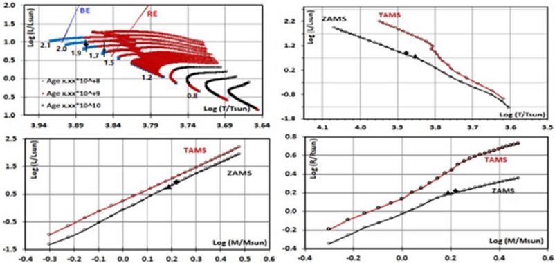 These results are in good agreement with a thesis by Bowman (2016) (see his Figure 4.12 for lowfrequency pulsations, ν ≤ 25d−1). The evolutionary tracks for the non-rotating model, as computed by Mowlavi et al. (2012), for both zeroage main-sequence stars (ZAMS) and terminal-age main-sequence stars (TAMS) with a metallicity of Z = 0.014 (solar metallicity), are presented in Figure 7. The absolute physical parameters of XX Cyg, are plotted as mass-luminosity (M-L), mass-radius (M-R), and H-R diagrams at Figure 7. The parameters are in good agreement with those expected for SX Phe variables in the logM−logL plane. XX Cyg is close to, or on, the ZAMS in all the diagrams of Figure 7 and lies halfway between the blue edge (BE) and red edge (RE) of the instability strip, as shown in the L-T relation (H-R diagram). To estimate the age of the system, we plotted theoretically calculated models (Mowlavi et al. 2012) for temperature versus luminosity (T-L) (Figure 7). From this diagram, and from McNamara and Feltz (1980), the age of XX Cyg should be approximately (0.949 ± 0.064) × 109 years, It is close to the age predicted by Zhou (2002) and Yang et al. (2012), which is (0.9 ± 0.3) × 109 years as shown in Table 1. The location of XX Cyg in the H-R diagram is shown in Figure 7. These parameters would explain the position of the star at or near the main sequence (Rodriguez and Breger 2001).
