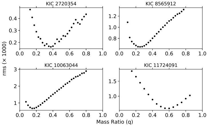 We apply this procedure by assuming detached and semi-detached configurations (MODE 2 and 5 in the WD code, respectively) for each target separately. Light curve modelling results indicate that KIC10063044 is a semi-detached system, while the remaining targets are detached systems. We show the results of the mass ratio search in Figure 1.