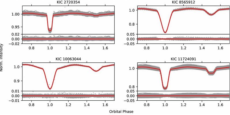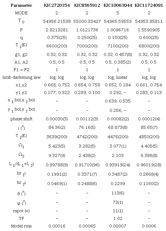 We use very high precision photometric data with 29.4 minutes of exposure time (long cadence), provided by the Kepler space telescope. The CCD camera of the telescope is capable of collecting photons between 4100 Å and 9100 Å, which greatly increases the precision. Prša et al. (2011) and Slawson et al. (2011) investigated the Kepler data and compiled the Kepler eclipsing binary catalogue1. This catalogue contains de-trended and normalized fluxes for each eclipsing binary. De-trending and normalization procedures are described in Slawson et al. (2011). We adopt detrended and normalized fluxes of the target stars from this catalogue. All-stars have four years of continuous photometry without any missing quarter, except KIC8565912, which was observed only in quarter 16 and 17. In total, 65072, 62697, 63112 and 4635 data points were obtained for KIC2720354, KIC10063044, KIC11724091 and KIC8565912, respectively. The Mikulski Archive for Space Telescopes (MAST) database reports fairly weak (2-3%) contamination from the possible background light sources. No short cadence data (58.9 second exposure time) are available for any of the targets.