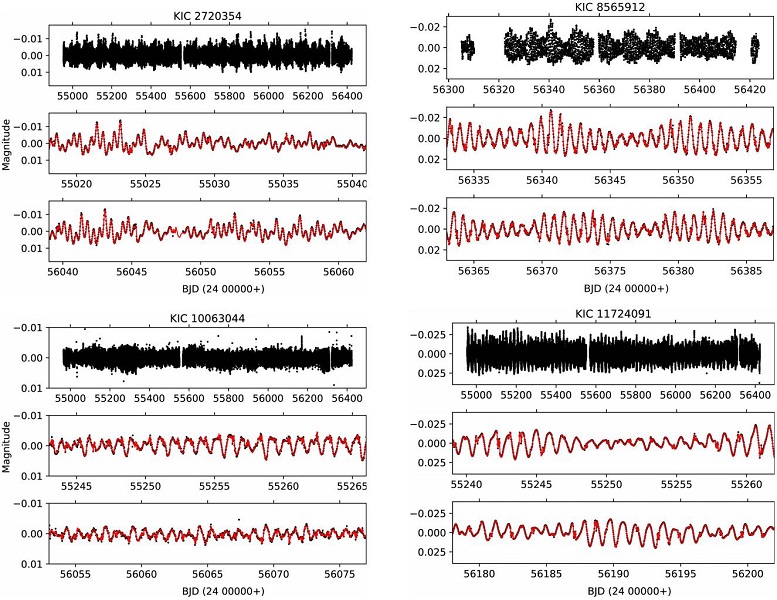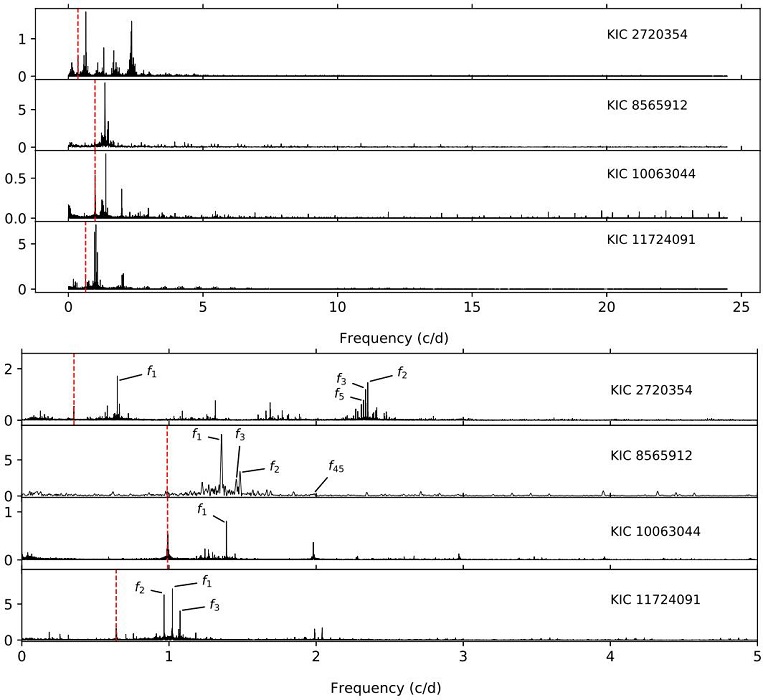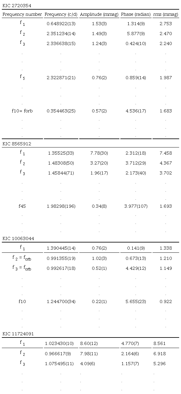 Inspecting Figure 5, one can easily notice a dominant group of frequency peaks below 5 c/d. In the case of KIC8565912 and KIC10063044, relatively low amplitude frequency peaks above 5 c/d also exist. The iterative prewhitening procedure results in 2406, 221, 1089 and 2535 frequencies above a significance level limit of 5 for KIC2720354, KIC8565912, KIC10063044 and KIC11724091, respectively. We use the Rayleigh criterion to check whether these frequencies are genuine or combination frequencies. We find the resulting number of genuine frequencies as 5, 4, 4 and 3 for our targets, in the same order as above. Following the method proposed by Kallinger et al. (2008), we calculate uncertainties of frequency, amplitude and phase of each extracted frequency. We tabulate genuine frequencies in Table 3 and plot multi-frequency analysis fits in Figure 4.