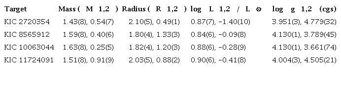 Keywords: binaries, eclipsing, stars, individual, KIC 2720354, KIC 8565912, KIC 10063044, KIC 11724091, stars, oscillations.