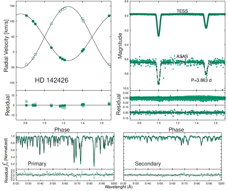 This system was relatively easy to model thanks to high quality photometric and spectroscopic data. First, we used the TESS light curve, which offers very good coverage in eclipses, and sufficient coverage out of them. With no third light contribution and no out-of-eclipse variation, we were able to derive a complete set of orbital and physical parameters, which are given in Table 4. We also analysed photometric data from the ASAS-3 archive (249 observations; a time base of ≈3300 d). HD 142426 turned out to be a double-lined binary (SB2), so we analysed a total of 10 FEROS spectra to cover the binary orbit. We checked the corresponding sky region of HD 142426 using the ALADIN interactive sky atlas (Bonnarel et al. 2000); no source sufficiently bright to affect the ASAS and TESS measurement is situated near our target.