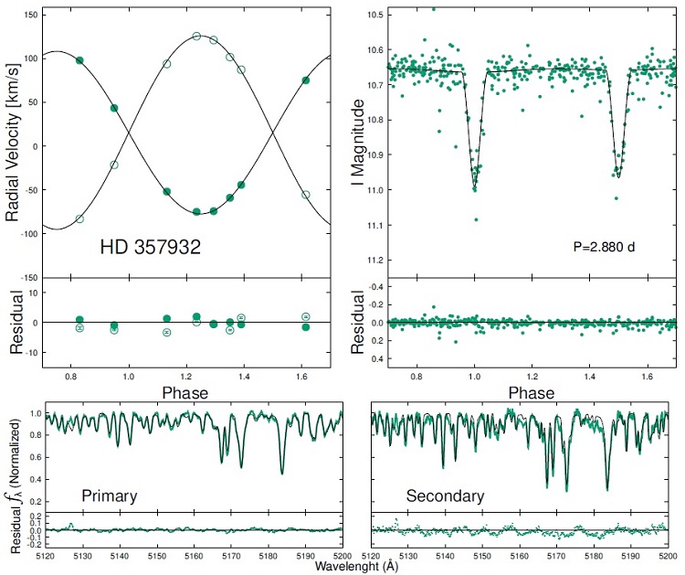 In order to corroborate the estimation of stellar parameters given in Table 4, we used the freely available, Python-based code ISPEC (the Integrated SPECtroscopic framework, Blanco-Cuaresma et al. 2014) to verify the primary and secondary stellar parameters. To maintain the atmospheric parameters we used the spectral synthesis approach, where the key drivers employ the code spectrum (Gray & Corbally 1994), the MARCS grid of model atmospheres (Gustafsson et al. 2008), solar abundances from Grevesse, Asplund, & Sauval (2007), and the atomic line list provided by the third version of the Vienna Atomic Line Database (VALD3, Ryabchikova et al. 2015). ISPEC synthesizes spectra only in certain, user-defined ranges, called ’segments’ which play an integral role in the analysis and are defined as regions of 100 Å around a certain line. We run the fit with the following parameters set free: effective temperature Teff, gravity log g, metallicity [M/H], and rotational velocity v sin i using a set of spectra spread over the orbital period at known times. The resolution R was always fixed to 47 000. The lines are quite narrow, so macro- and microturbulence velocities vmic , vmac were automatically calculated by ISPEC from an empirical relation found by Sheminova (2019) and incorporated into the ISPEC program.