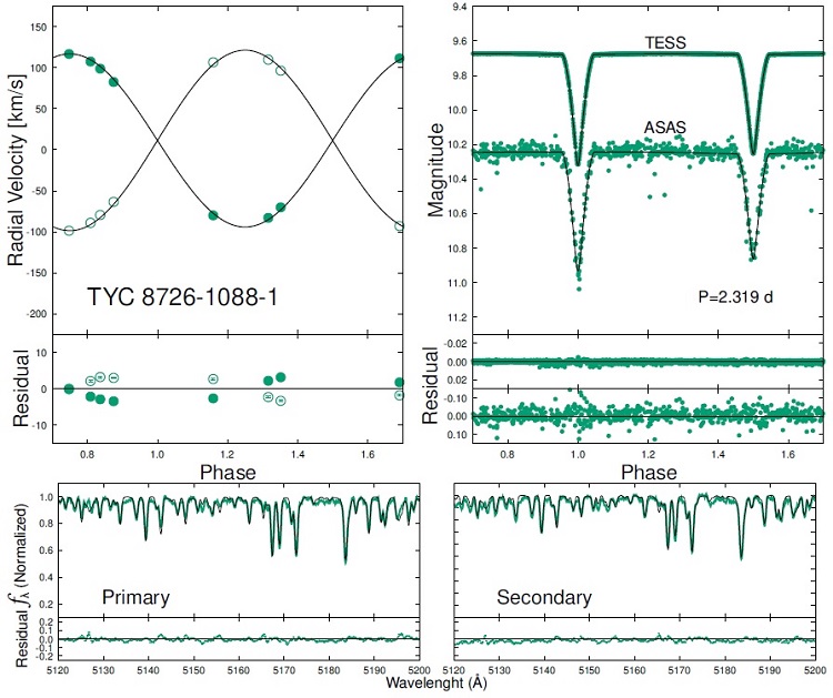 ABSTRACT: We combined photometry from the All Sky Automated Survey (ASAS) and the Transiting Exoplanet Survey Satellite (TESS) with high-resolution spectroscopy from the ESO public archive to obtain, for the first time, absolute physical and orbital parameters for six double-lined detached eclipsing binary systems with solar-type components. The atmospheric parameters of the stars have been determined from the individual spectra obtained with a disentangling method. One of the targets resulted in a triple system, and lines coming from three components in spectra show that each component’s contribution to the total light is approximately equal. For the six systems the masses and radii of the components were obtained with a precision better than 3 %. A comparison of the observed stellar parameters with the prediction of stellar evolution based on the MESA stellar evolution code shows reasonable agreement.