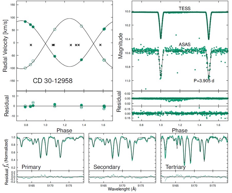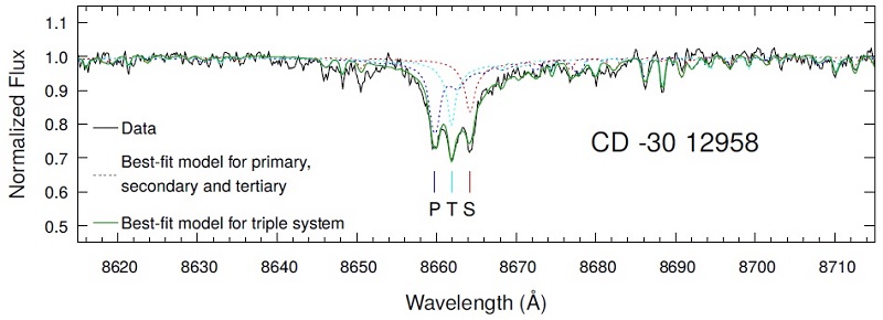 In the high-resolution FEROS optical spectra, CD −30 12958 appeared as triple-lined. The nearly equal peaks on the cross-correlation function (CCF) corresponding to the primary and secondary components are the strongest in this system, followed by a tertiary corresponding to a slightly weaker one (Figure 6 and 7). We measured the radial velocity of all components, denoted as a black cross in Figure 8, with the primary (filled circle) and the secondary (open circle) stars.