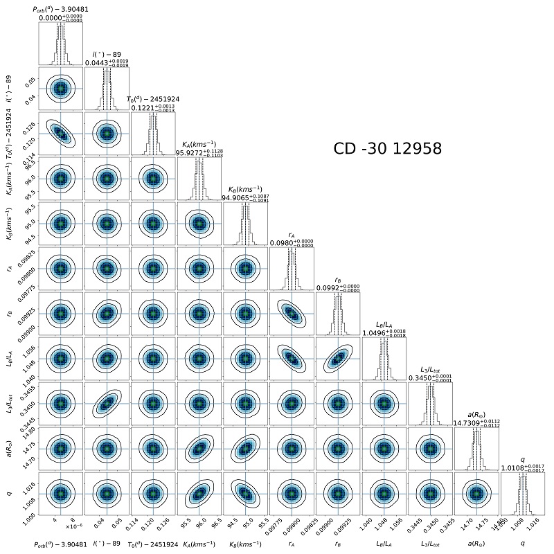 In order to calculate the random errors of the initial values of parameters (including l3), we used the Monte Carlo simulation algorithm implemented in JKTEBOP , which was found to quantify the correlations between the parameters. For each ASAS I-band and TESS light curve, a ‘synthetic’ light curve was constructed by evaluating the best-fitting model at the phases of observation. This process was undertaken 10 000 times for each observed light curve of the system. The standard deviation of the distribution of values for each parameter has been calculated. A sample plot of the distributions of different parameter values for CD −30 12958 is shown in Figure 9. From the predicted temperatures for the primary and secondary, we determined the distance as 290(13) pc with the E(B − V ) value derived from Na I D1 given in Table 4. The resulting distance is inconsistent with the Gaia DR2 value of pc; however, this value is significantly less precise. There is no measurement for this system in the Gaia eDR3. Notably, with its physical parameters and probable metallicity and age, the primary and secondary can be considered to be solar analogues. CD −30 12958 is interesting, as examples of such stars in eclipsing systems, particularly with well-measured absolute parameters, are very rare. In any case, eclipsing time variation (ETV) monitoring of such systems helps to identify their nature.