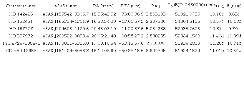 All targets in our study have been explored as photometrically variable stars using data from the third phase of the ASAS (Pojmanski 2002). The third phase of the project, ASAS-3, which has produced a catalogue of about 50 000 variable stars (Pojmanski, Pilecki, & Szczygiel 2005), lasted from 2000 until 2009 (Pojmanski 2002) and has been monitoring the entire southern sky and part of the northern sky (δ < +28◦). The ASAS-3 system, which occupied the ten-inch astrograph dome of the Las Campanas Observatory (Chile), consisted of two wide-field tele- scopes equipped with f /2.8 200 mm Minolta lenses and 2048×2048 AP 10 Apogee detectors, covering a sky field of 8.8◦ × 8.8◦. Data collection was done through standard Johnson I and V filters during the ASAS-2 and ASAS-3 surveys, respectively. Around 107 sources brighter than about V = 14 mag were catalogued. With a CCD scale of about 14’’.8 per pixel, the astrometric accuracy is around 3-5’’ for bright stars and up to 15’’ for fainter stars. Thus, the photometry in crowded fields, such as in star clusters, is rather uncertain. The typical exposure time for ASAS- 3 V-filter observations was three minutes, which resulted in reasonable photometry for stars in the magnitude range 7≤V≤14. The data from ASAS-3 also provides accurate information about various parameters, once the mass ratios from the radial velocity measurements are available. Thus, for the preliminary light curve analysis, we used the ASAS V-band photometry.