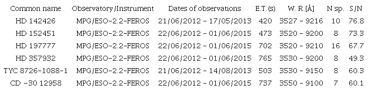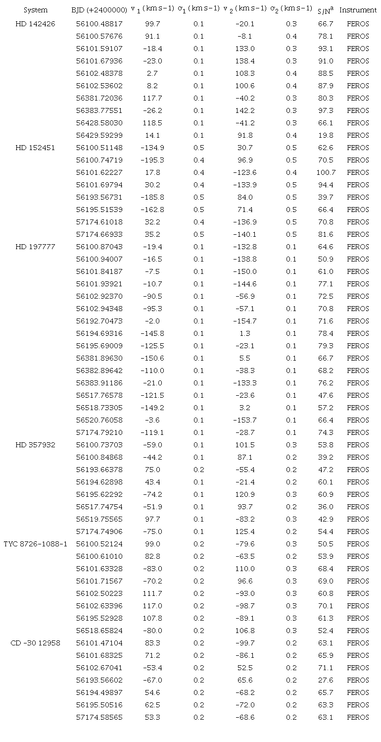 We queried the ESO Science Archive Facility looking for optical spectra with a resolution high enough to detect the lines of the binary components in the composite spectrum. Targets analysed in this study were observed multiple times in order to search for planets via radial velocity variation.3 Therefore, we found a large number of spectra, which show good orbital phase distribution for each target. We retrieved FEROS archival data for our targets listed in Table 1. We preferred the FEROS instrument (attached to MPG/ESO 2.2m telescope located at the La Silla Observatory in Chile, Kaufer et al. 1999) motivated by its characteristics: large wavelength range (the complete optical spectral region from ≈3500 to ≈9200 Å in only one exposure), high resolution (R = 48 000), and high spectral stability, which makes it suitable for detecting narrow ab- sorption features in a wide variety of spectral lines. We refer to Table 2 for a summary of the spectroscopic observations of the systems. There, in successive columns, we show the dates of observations, exposure times, wave- length ranges, number of spectra retrieved and analysed and the averaged signal to noise ratios.