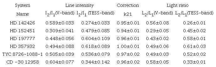 In order to convert I2/I1 into light ratios, we calculated the corrections k21 following the method of Graczyk et al. (2018). The final spectroscopic light ratios corresponding to the true V-band and TESS-band light ratios were computed simply as the product k21×(I2/I1), and these are also given in Table 3.
