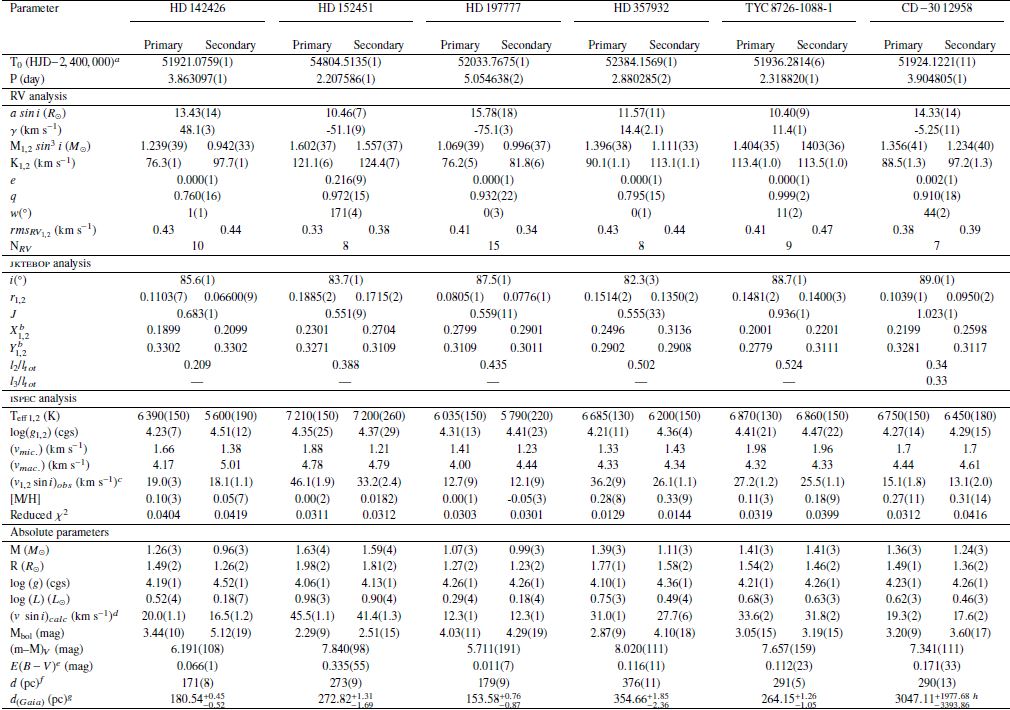 In this study, we present physical parameters of six targets from our investigation, with the aim of characterizing interesting eclipsing binary systems by taking into account all available data. The orbital and physical parameters of the stars are shown in Table 4. The errors of the parameters, also given in Table 4, are calculated with the JKTABSDIM procedure using the parameters and uncertainties from the radial velocity and light curve analysis described above.