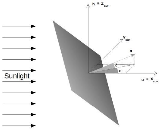 To derive the dynamics of a solar sail propelled spacecraft it is convenient to define a Spacecraft Oriented Frame (SOF), as illustrated in Figure 1. The SOF’s X axis points in the radial direction of a heliocentric inertial frame. It has the same direction of the incoming sunlight, which is indicated by the unit vector u. The SOF’s Z axis is defined as having the same direction of the spacecraft’s orbital angular momentum, indicated by the unit vector h. The Y axis is defined in agreement with a coordinate system in dextrorotation. The sail’s orientation is represented by the unit vector n orthogonal to the solar sail surface. Two important angles are consequently defined, the azimuth α and the elevation δ, necessary to resolve n in the SOF. An important consideration is made: the n unit vector exists only in the opposite semi-space of the sunlight beam or, in other words, opposite to the sunlit layer of the solar sail. This limits both the azimuth and elevation angles to the interval [−90,90]◦.