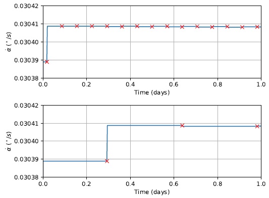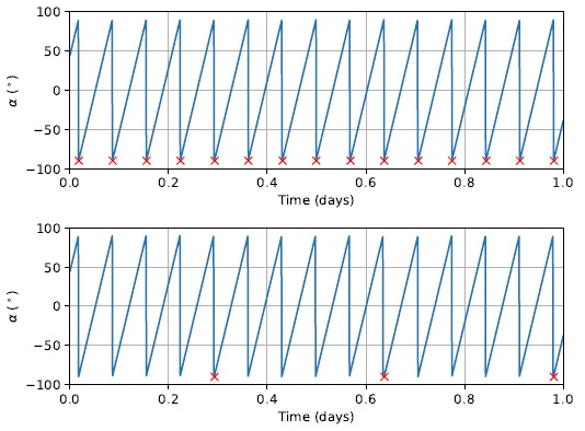 Figure 9 illustrates some examples of the proposed strategy. Every instant of an attitude maneuver is indicated with a red cross in the graph. Once again, only the first day of simulation is presented with the intention of zooming on the X axis values and having a better view for further analysis. The top graph corresponds to an attitude maneuver once every orbital revolution (Nrev = 1). The bottom graph corresponds to an attitude maneuver once every five orbital revolutions (Nrev = 5).
