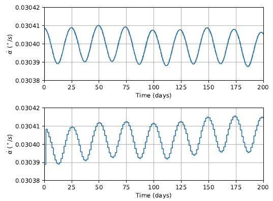 As ε increases, so does the orbital period. Therefore, is supposed to decrease in this situation. The inverse is also true. As ε oscillates, so does . In the case of Nrev = 20, is it possible to observe an overall increase in the average value of , which is an indication of an overall loss of ε and, consequently, average altitude. An example of Nrev = 20 was considered instead of Nrev = 5 to make this even clearer in the graphical representation of the discrete range of values of . As Nrev increases, the longer the sail maintains its azimuth angle rate of change.