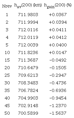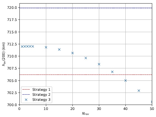 It became interesting to simulate a range of Nrev to evaluate for how long the spacecraft can be left without any attitude maneuver and still have a better performance than Strategy 1. The average altitude after 200 days of simulation hav(200) and its gain compared to the initial average altitude hgain (equation 6) are presented in Table 2, as a function of Nrev