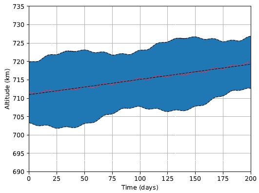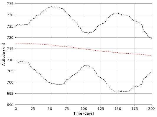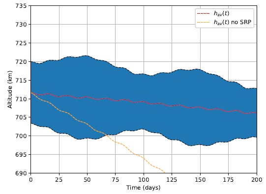 The blue region of the plot is in fact the altitude over time. It is seen as a blur due to the large scale of time covered in the X axis. As expected, it behaves as a sinusoidal wave enveloped by two other curves of the maximum and minimum altitude reached at every revolution, which in turn are seen as the dashed black lines. The dashed red line is a simple average of the envelope curves and is considered to be the average altitude as a function of the simulation instant in days hav(t[days]). It starts at a value of 711.6867km and decreases 5.5204km to 706.1663km after 200 days. The dashed orange line indicates hav(t) for a simulation with disabled solar sailing, meaning a null SRP net force, to demonstrate the importance of solar sailing for maintaining the spacecraft’s average altitude over time. After 200 days, hav(200) = 671.6718km, having lost an extra 34.4945km, or 7.25 times more, of average altitude in comparison with the situation where the solar sailing is active.