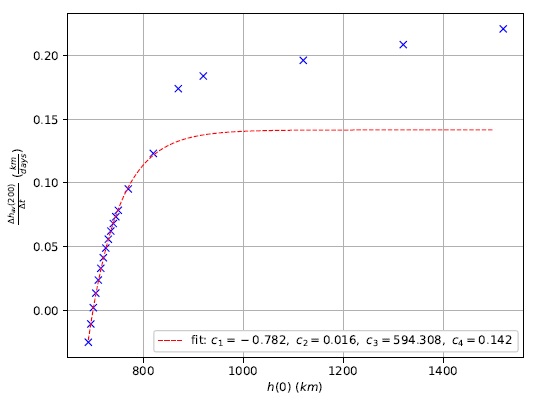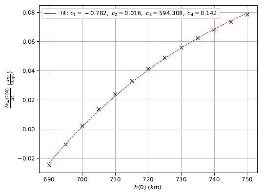 An interesting analysis comes from the sweep of the mission’s initial altitude h(0). As indicated by Figure 5, the drag forces are greatly responsible for the spacecraft’s altitude decay. An also known fact is that, as the altitude decreases, the drag forces increase in magnitude. In turn, this would decrease the slope of the regression line. The inverse is also expected to be true. Therefore, a sweep of values in the [690,750]km interval was made (Figure 14). In addition, given the exponential nature of the atmospheric model considered, the data is fitted to the function presented in equation 7