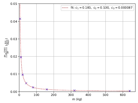 The figure shows that, even for a massive spacecraft of nearly half a ton, the regression line’s slope still maintains a positive value. Despite being a fitted parameter, the fact that c3 is greater than zero indicates a limit, given this mission’s initial conditions and the employment of Strategy 2, which would guarantee no decay for the spacecraft’s average altitude. It means that, in theory, any spacecraft can use this technique.