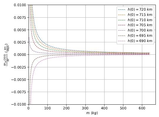 In the search for negative , the initial altitude was changed to smaller values and the same curve fit procedures were performed (Table 3). From Figure 17 it is possible to see that is more sensitive to variations of h(0) for lower m, as expected. In fact, a negative starts to be observed for negative values of c1, which happens with h(0) lower than 700km. This indicates a minimum altitude where Strategy 2 can be employed to keep a positive for a wide range of spacecraft masses. The present study showed that the initial altitude of the spacecraft is the determinant variable to allow this technique to be used to keep the spacecraft in orbit, and the mass does not influence the results.