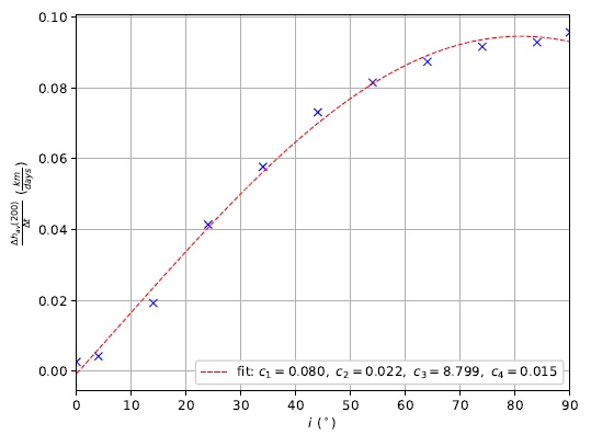When considering a problem with the objective of increasing the average altitude over time, the desired direction in which the resulting SRP acceleration component needs to be maximized is different for various values of the orbital plane inclination. This results in slightly different desired azimuth angles over the span of an entire orbital revolution. In addition, it would be interesting to investigate different mission scenarios, considering whatever engineering limitations or obligations an organization might have in determining the orbital plane inclination of its mission. Inevitably, the variation of this orbital parameter is another interesting analysis to be made (Figure 18). Given the trigonometric relation of this parameter to the system’s dynamics, the data is fitted to the form presented in equation 9