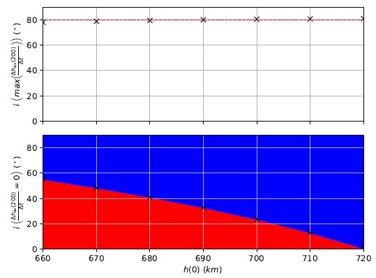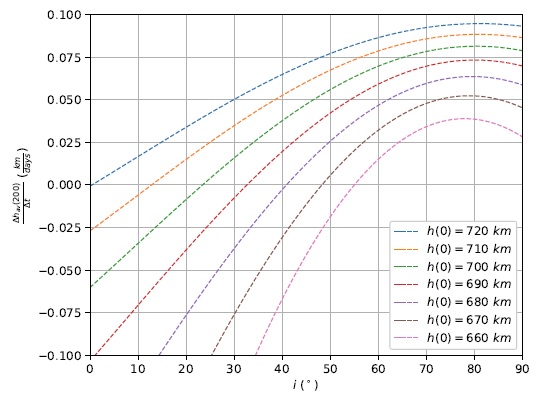 Figure 20 also displays a dashed red line that represents the mean value of i for from the fitted curves, which is approximately 79.8◦. In spite of this value, the verified best case scenario of i for the employment of Strategy 2 is an inclination of 90◦. In the bottom graph, the blue area represents regions of h(0) and i where Strategy 2 is able to maintain a positive , while the red area represents the opposite region, of negative . Two remarks have to be made in this case scenario. First, for h(0) > 720km, Strategy 2 is able to maintain an average altitude gain for any i, including equatorial orbits. Second, for lower h(0), the drag forces are greatly superior, reducing the linear behavior of hav(t) and making it very difficult to fit parameters into the same function used for the other h(0) cases. This can already be verified with the parameter values of h(0) = 660km in Table 4, which are different from the rest by an order of magnitude. Nevertheless, it was possible to verify that for h(0) < 650km there are no positive for any i, which indicates that this is a limiting h(0) where Strategy 2 cannot maintain an average altitude gain, even for the best value of the inclination.