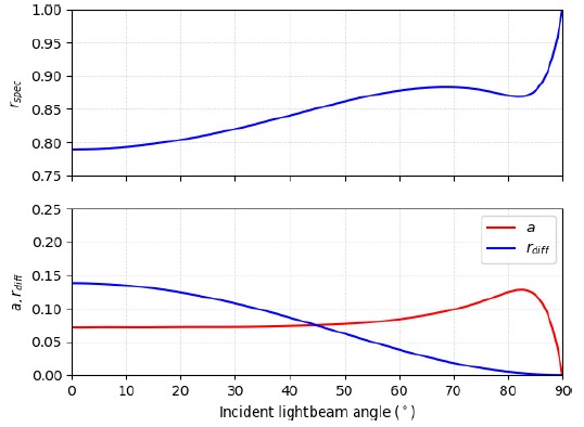 Further considerations are made in regard of the optical coefficients absorptivity α, diffuse reflectance rdiff and specular reflectance rspec. They are all considered to be a function of the angle of the incident light beam, as portrayed in Figure 2.