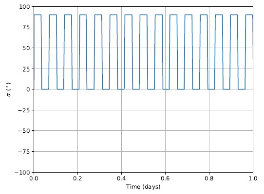 In order to maximize the thrust component in the SOF XY-plane, δ is always equal to zero. Consequently, only the value of α changes. The first day of simulation (with the purpose of zooming in the X axis) for this strategy is illustrated in Figure 4.