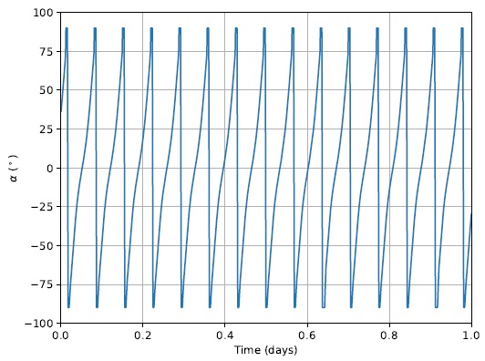 To determine this optimal strategy, it is necessary to search for the orientation which gives the maximum component of T at the ṙ direction. Considering one point of the simulation at a time, that is to say, having a fixed position r and velocity ṙ, this is a well bound one dimensional convex problem, with α constrained in the interval [−90,90]◦. A simple hill climbing search algorithm is sufficient, and was used in this study to find the solutions. The first day of simulation (again, with the purpose of zooming in the X axis) for this strategy is illustrated in Figure 7.