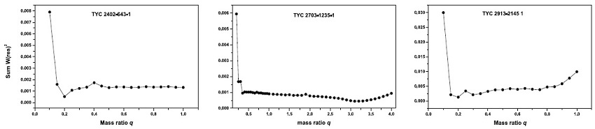 The q-search procedure was used, leaving as free parameters the temperature of the secondary components T2, the inclination i of the systems, the non-dimensional surface potentials (Ω1=2) and the monochromatic luminosities of the primary components L1. Other parameters such as g2,A2,L2,x2 and y2 are not free but fixed to their theoretical values.