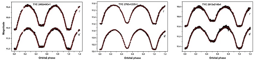 The full set of parameters from our solutions is listed in Tables 8 and 9. The results of our modeling and the obtained fitted curves are shown in Figure 2, while graphic representations of the three systems are shown in Figure 3, using the Binary Maker 3.0 software (Bradstreet & Steelman 2002).