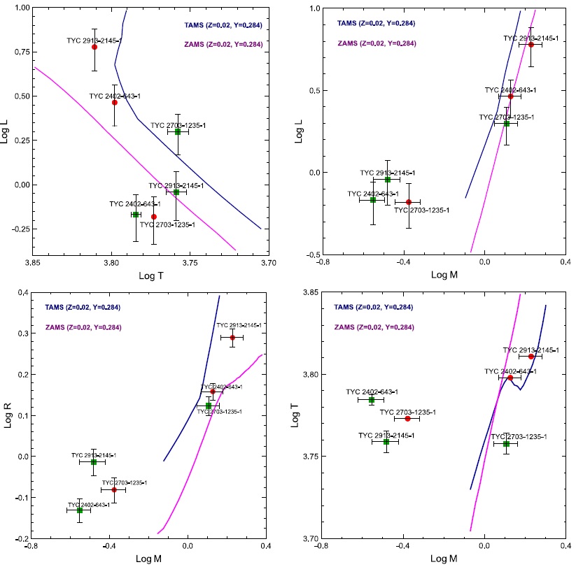 We used the estimated relative elements of the systems as reported in Table 10 to investigate the evolutionary states of our targets by comparing the location of their components on the main sequence (MS) diagrams expressed as logT-logL, logM-logL, logM-logR, and logM-logT. We built the isochrone tracks for the zero age main sequence (ZAMS) and the terminal age main sequence (TAMS) according to the PARSEC models (Bressan et al. 2012), as shown in Figure 4. As the PARSEC models extend up to 30 Gyr we limited the TAMS evolutionary tracks to stars with masses larger than 0.7M⨀.