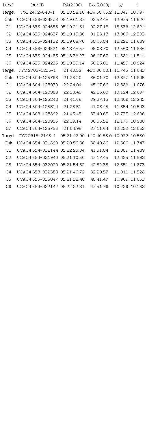 The color transformation was applied along with the previously estimated transformation coefficients of the optical system. To obtain the magnitudes in the respective color bands for the comparison and check stars we used the catalogue APASS DR9 Henden et al. (2015) (Table 6).