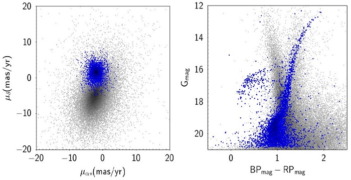 To evaluate the completeness of our DIA photometry we compared the number of stars we detected and measured in the FoV of our images, with the ones measured by Gaia-eDR3. Of the 76 235 stars considered for the membership analysis, only 12 433 are in our FoV, and we were able to measure 4845. In Figure 2 we confront these two samples as a function of magnitude. We can see that our DIA photometry is complete down to G=16.5 mag, which comfortably includes the horizontal portion of the HB, and it is fairly complete down to G=18.5 mag, which encompasses the vertical portion of the HB in the CMD.
