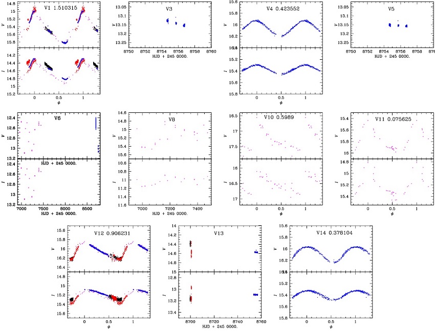 Of the 14 known variables in M56, listed in Table 1, only V1-V6 and V12-V14 are within the FoV of our images. Variables V7, V8, V9, V10 and V11 are outside the FoV of our images and have been identified as being field variables in the CVSGC and have also been confirmed as such by the membership analysis performed in § 3. For the sake of completeness, we tried to recover their light curves from the Gaia- DR2 photometry (Gaia Collaboration et al. 2018) but we were only able to do it for V8, V10 and V11. The variables V7 and V9 do not possess the variability flag associated by Gaia and therefore were not measured. For V8, V10 and V11 we proceeded to transform their Gaia G, GBP , and GRP bands into the VI Johnson standard system to make them consistent with our photometry. For this purpose, we used the relations provided by J.M. Carrasco and which can be found in the Gaia-DR2 documentation1 (2018: Gaia team). The light curves of the known variables and the ones recovered with Gaia are displayed in Figure 3.