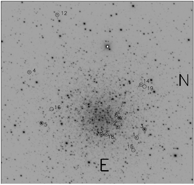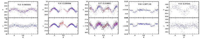The small number of reported variables present in M56 prompted a rigorous search in order to provide a more complete sample for our analysis. We approached this task by using the string-length method (Burke et al. 1970, Dworetsky 1983). We phased each light curve in our data with periods between 0.02 d and 1.7 d in steps of 10−6 d. In each case, the length of the line joining consecutive points, called the string-length and represented by the parameter SQ , was calculated. The best phasing occurs when SQ is minimum, and corresponds to the best period our data can provide. This method led us to the discovery of five new bona fide variables: one SX Phe, three EB and one RRc, and were named V15-V19. According to the method described in § 3, V16 (EB) and V19 (RRc) are field variables. Their light curves are displayed in Figure 4. The ones deemed to have a high probability of being cluster members, (coded M1 and M2 in Table 1), are in the expected region of the CMD (Figure 5), in good agreement with their variability type. All variables listed in Table 1 that are contained in our FoV are identified in the cluster chart of Figure 6.