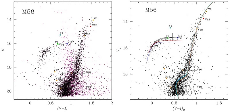 ABSTRACT: We present a VI CCD photometric study and a membership analysis of the globular cluster M56 (NGC 6779). This produced a CMD decontaminated from field stars, which enabled a better confrontation with theoretical isochrones, zeroage horizontal branches (ZAHB) and post-ZAHB evolutionary tracks. Post He-flash evolutionary models with a He-core mass of 0.5 M⨀ and envelopes of 0.04 - 0.18 M⨀, cover the complete horizontal branch. Models with total mass ≈ 0:68 M⨀ explain the RR Lyrae, while those with a mass ≈ 0:56 M⨀ and a very subtle envelope, explain the Pop II cepheids with a progenitor in the blue tail of the HB. Based on the Fourier decomposition of the V light curve of a single cluster member RRc star, we determined a metallicity of [Fe=H]ZW = -1:96±0:09. Several independent distance determination approaches lead to a mean distance to M56 of 〈d〉 = 9.4 ± 0.4 kpc. Finally, we report 5 new variables: one SX Phe, three EB, and one RRc.
